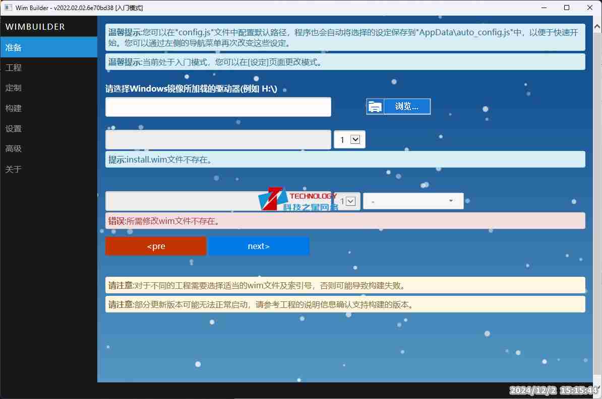 - 选择源文件和基础文件:运行WimBuilder2后,用户需选择源install.wim文件以及基础wim文件,如boot.wim或winre.wim等.