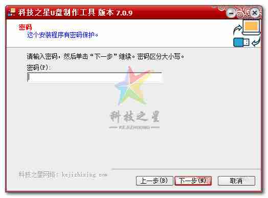 密码请群内[QQ群:56116458]免费获取或者自行扫描如下公众号二维码回复关键词获取【科技之星U盘】获取安装密码。公众号进入