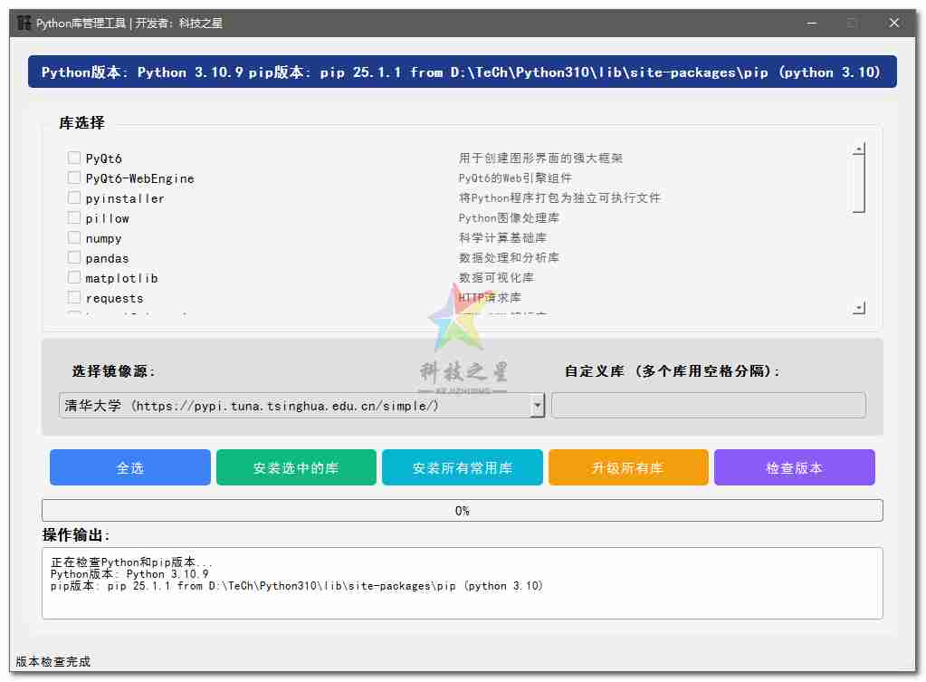 - 常用库选择:内置25个常用Python库(如PyQt6、NumPy、Pandas、Matplotlib等),可单独或批量选择安装。