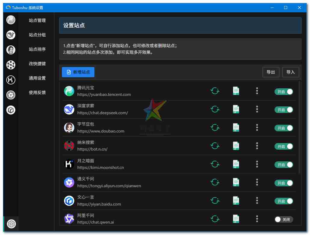 Tuboshu是一款桌面应用转换工具,让你用快捷键魔法般控制任何网页应用!基于Electron构建,完全开源免费,还支持将多个网站打包封装成合集,非常便携实用。所以,无论你是需要频繁切换工具的设计师,还是管理多个平台账号的运营人员,抑或专注工作希望提高效率的普通用户,Tuboshu 都可能成为你数字工具箱中不可或缺的一员