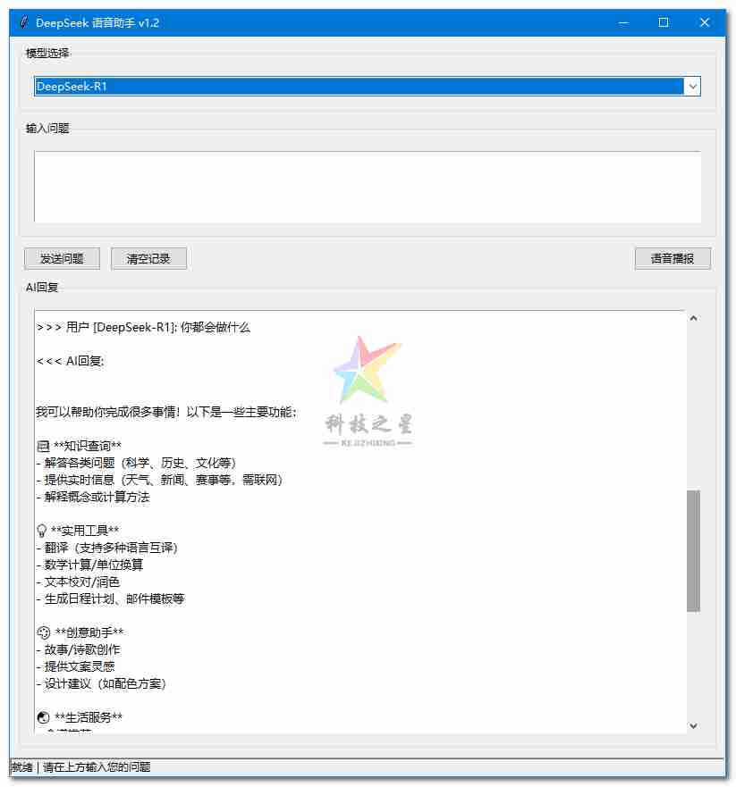 您好!感谢您对DeepSeek AI助手-语音功能科技之星的关注。我们提供的DeepSeek-V3、DeepSeek-R1和DeepSeek-R1-0528三种模型能满足不同场景需求。如有技术问题或需要打包工具,请参考推荐的Python智能打包工具V4.6高级版或PyQt6图形化工具。我们致力于提供高效智能的AI体验。期待您的进一步交流!