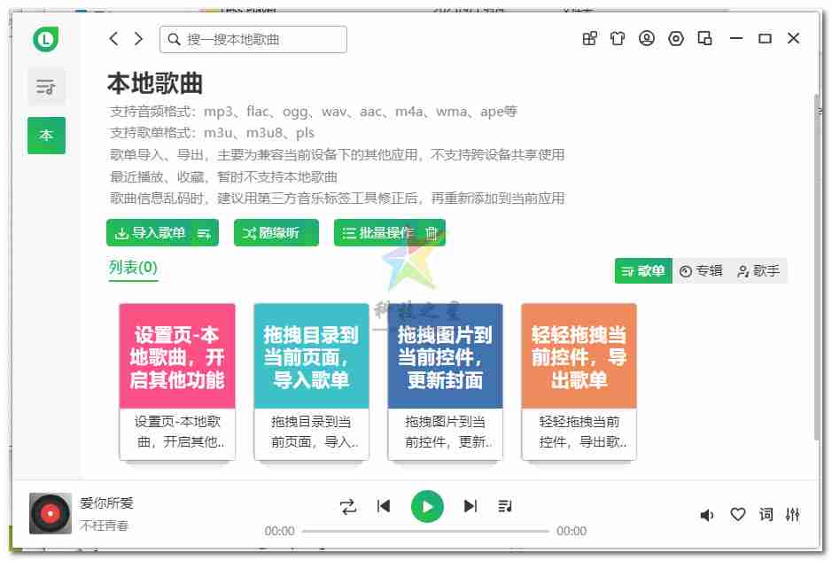 - 🎵 格式兼容性:支持本地主流音频格式(MP3、FLAC、OGG、WAV等),同时可导入外部歌单文件(M3U、PLS格式),无缝衔接本地音乐库;