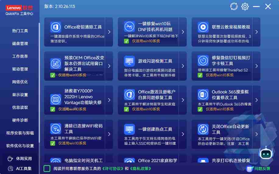 工具中心会实时同步联想官方最新开发的 QuickFix 工具,无需手动下载更新包: