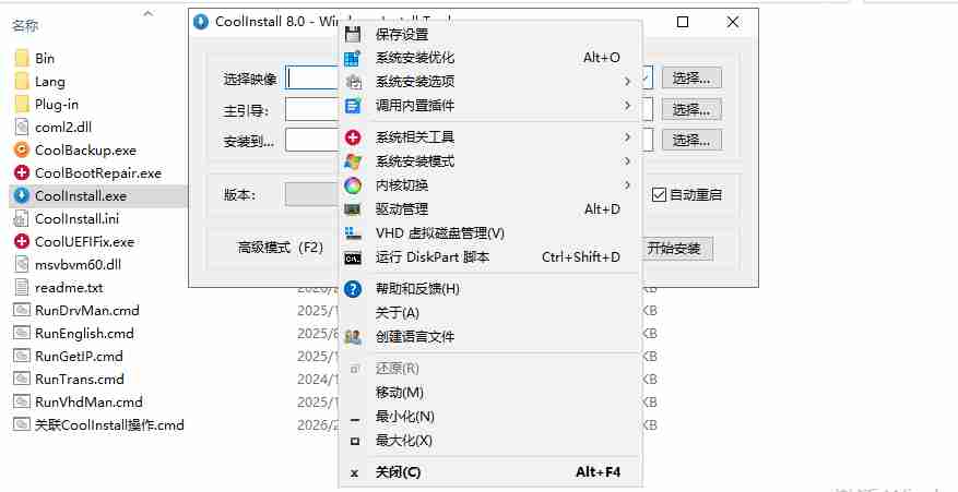 - 功能增强:CoolBackup/CoolInstall新增命令行参数,支持单独运行指定功能(-d驱动管理/-vVHD管理/-i离线IP查看);系统安装新增卷标修改、强制处理无人值守文件等优化选项