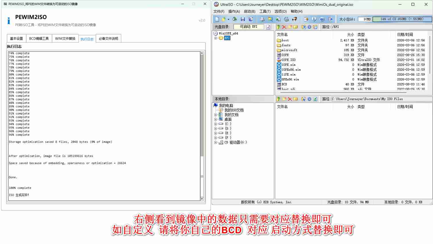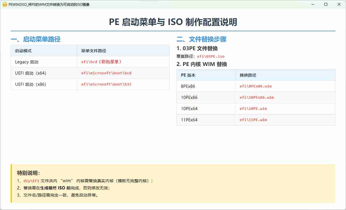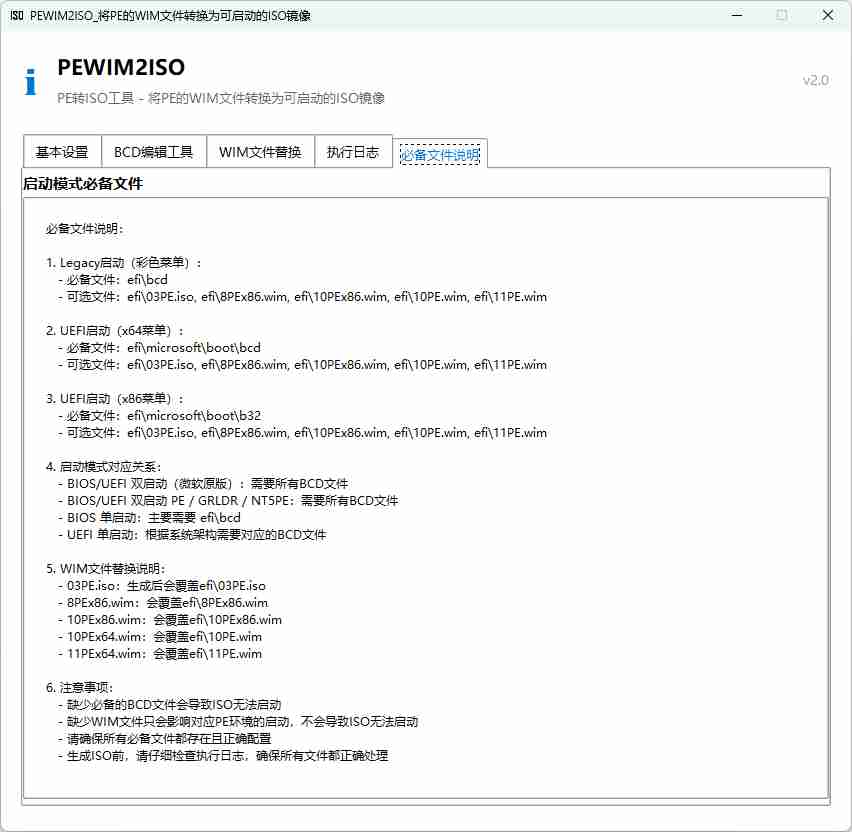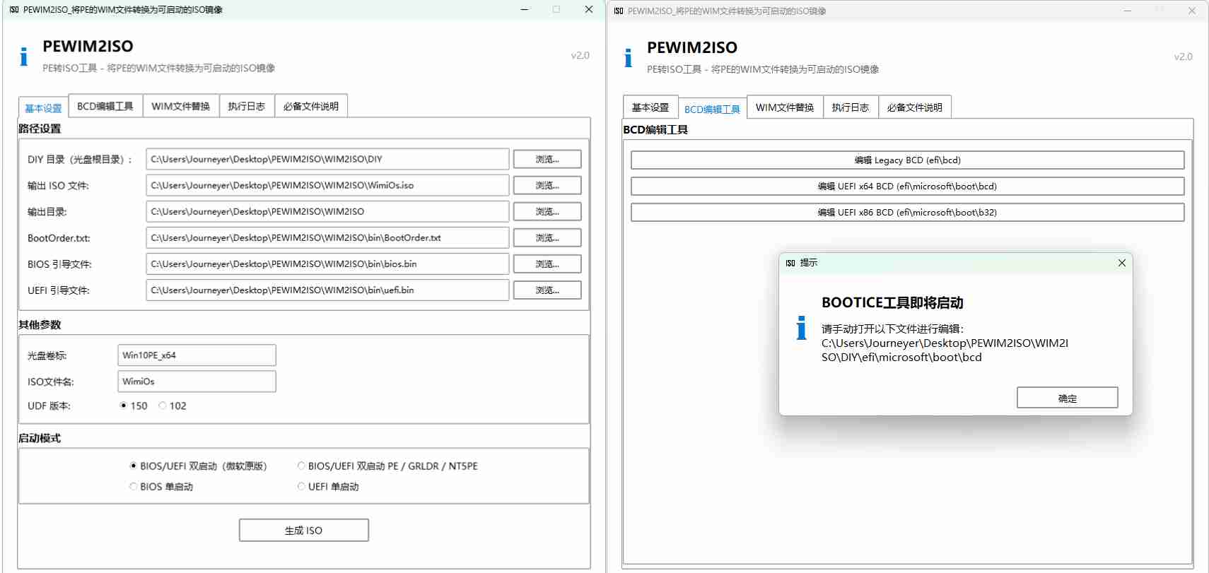 PEWIM2ISO 是一款专业的PE工具,用于将PE的WIM文件转换为可启动的ISO镜像。它支持多种启动模式,包括BIOS/UEFI双启动、BIOS单启动和UEFI单启动,适用于不同场景的需求。