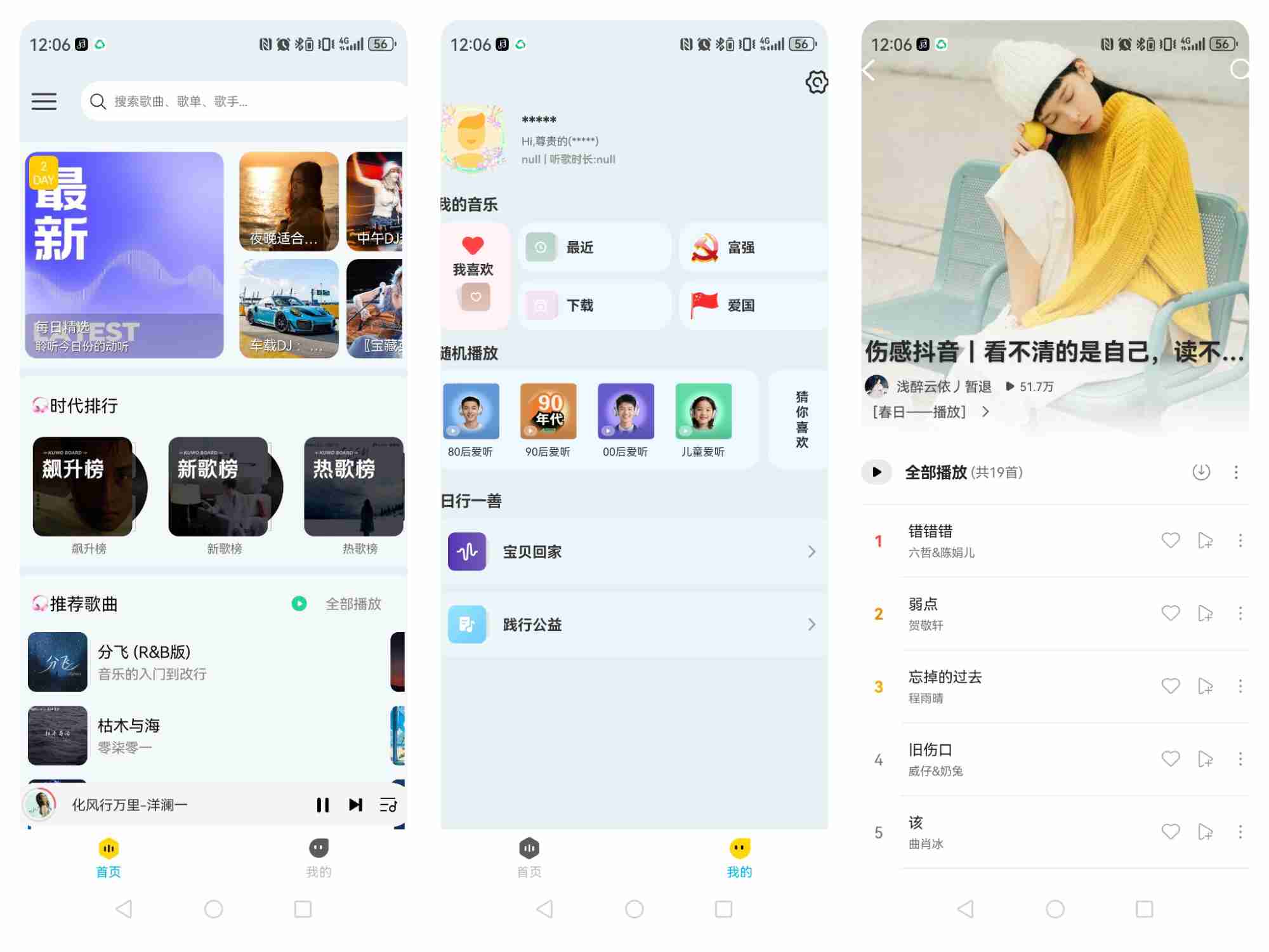 - 热门榜单:抖音热歌、流行、说唱、电音、国风等。