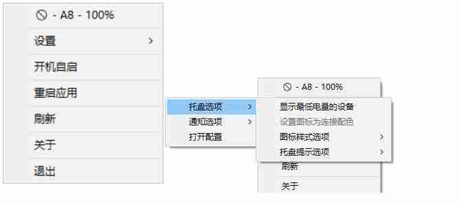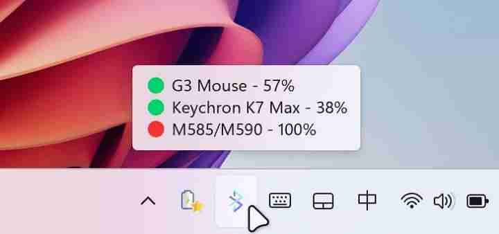 - 首次运行会自动扫描已配对的蓝牙设备,托盘图标旁显示当前设备电量百分比;