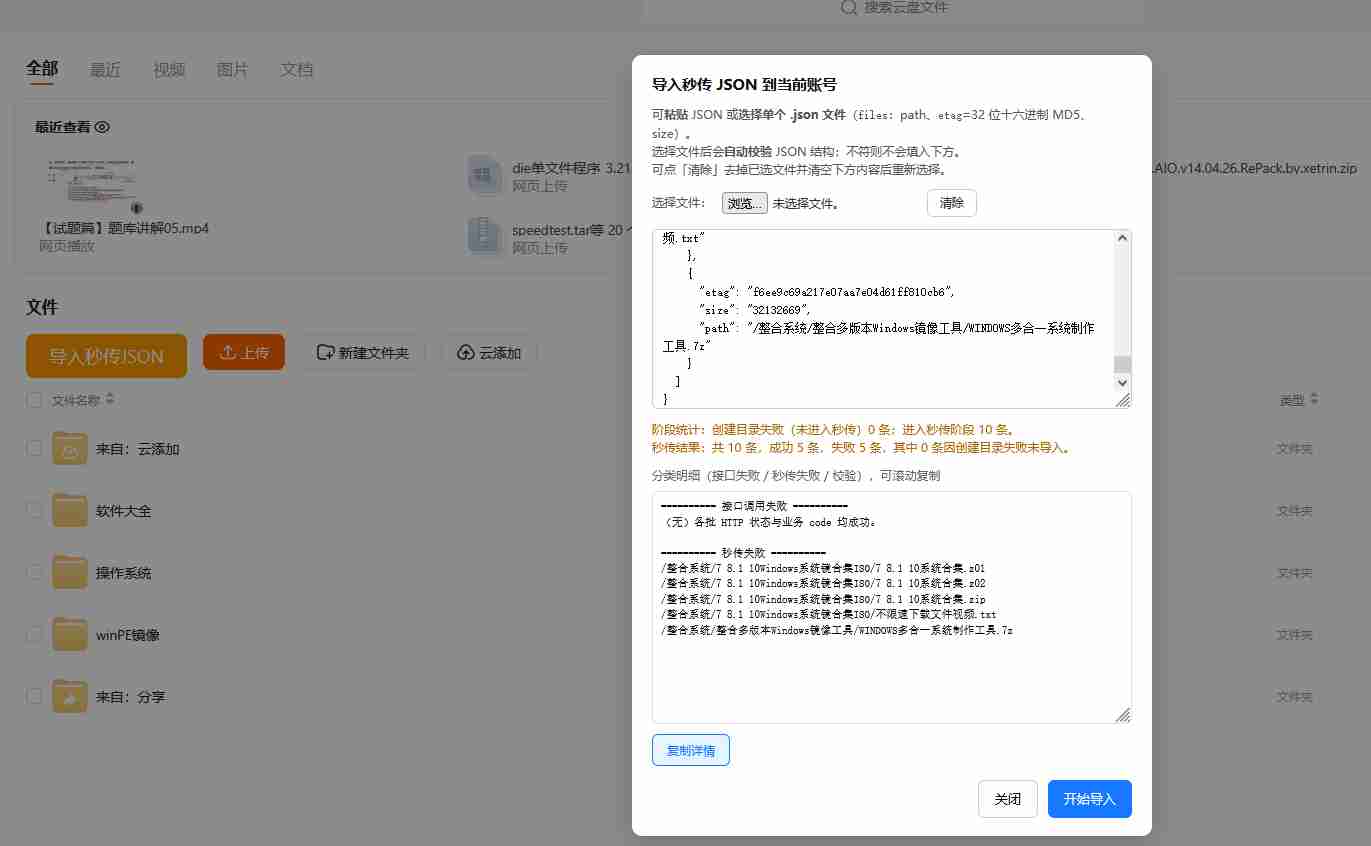 - 打开光鸭云盘网页端/客户端,找到「导入秒传JSON」功能,手动粘贴复制的JSON内容,或选择本地JSON文件上传导入,即可一键批量转存资源。