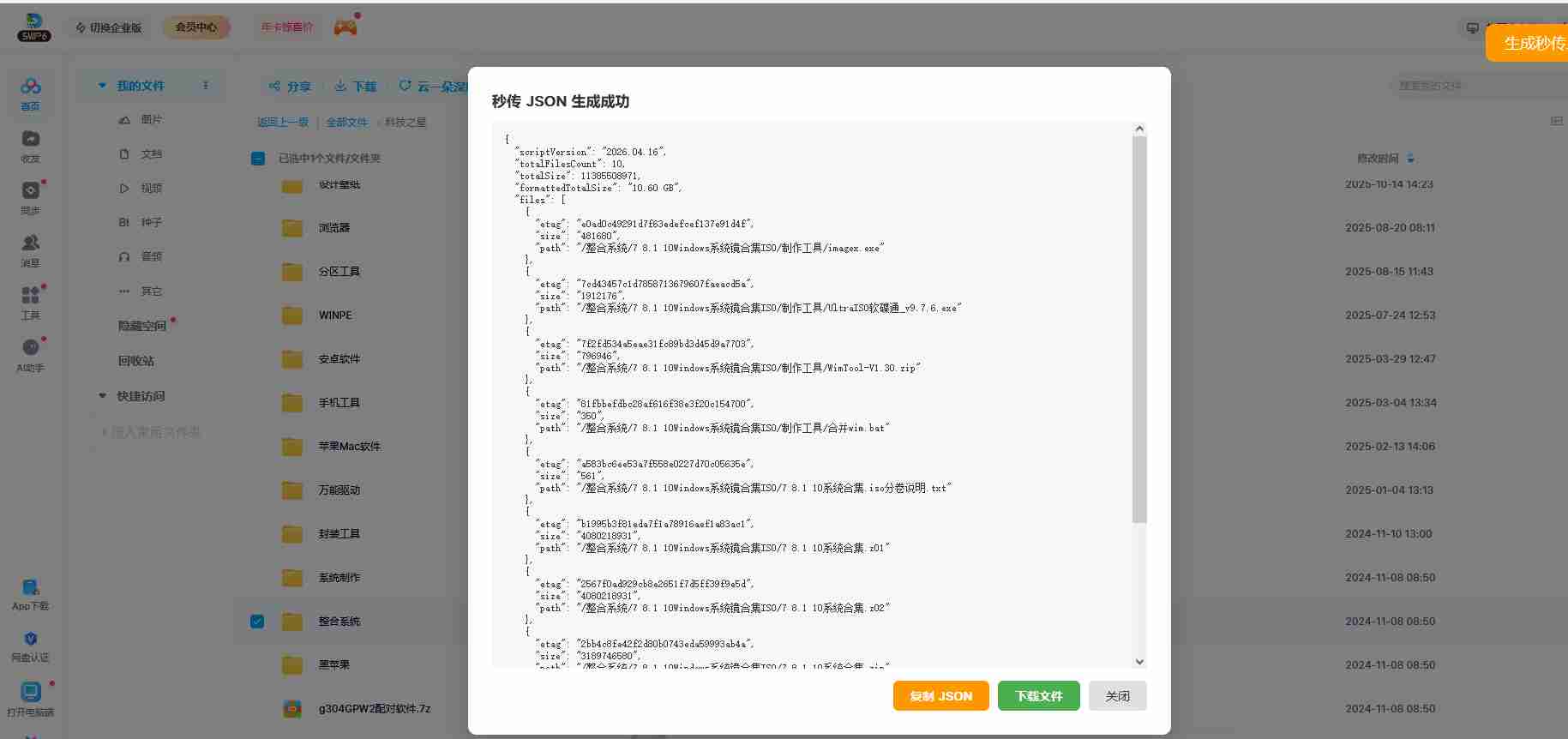- 打开目标网盘页面(百度网盘),勾选需要批量转存的文件/文件夹,点击页面右上角「生成秒传JSON文件」按钮。