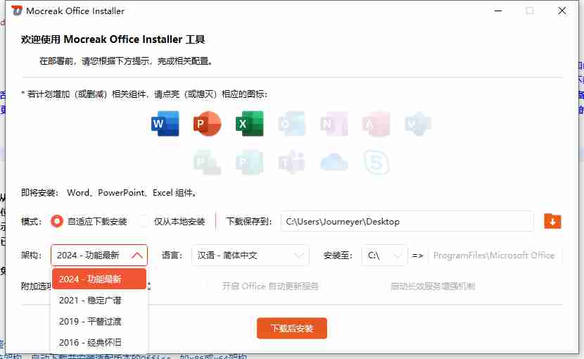 - 启动软件:打开Mocreak,选择直接下载和安装Office或从本地安装。
