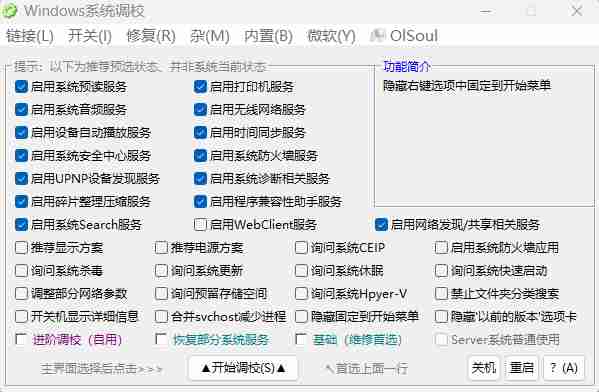 需要注意的是,在使用OlSoul进行系统调校时,要谨慎操作,仔细阅读每个功能的说明和提示,以免因误操作导致系统出现问题。如果对某些功能不确定是否需要开启或关闭,可以先保持默认设置。
