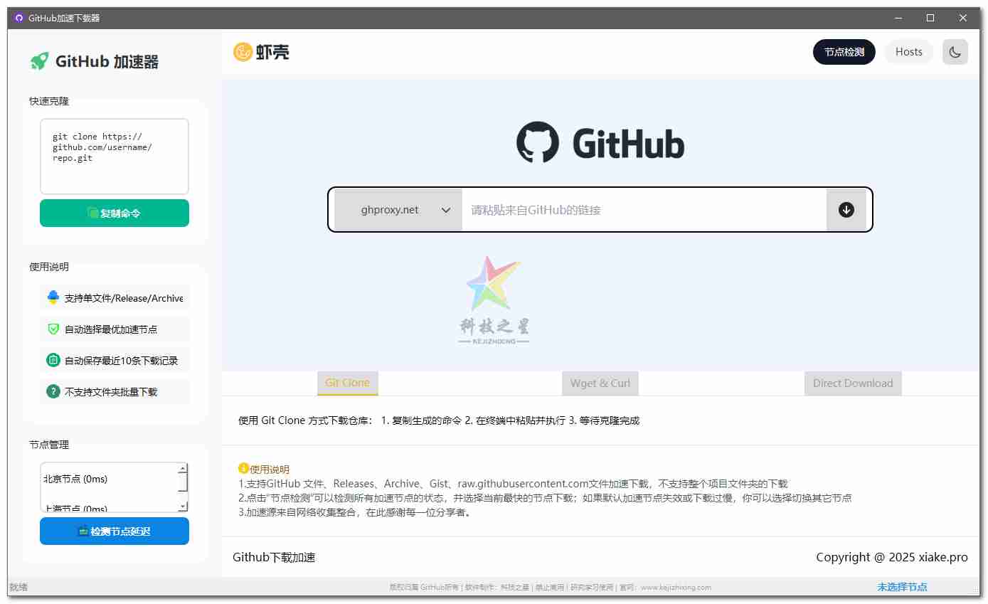 该网站(进入【虾壳Github】)支持从 GitHub、Releases、Archive、Gist 以及 raw.githubusercontent.com 等平台下载文件,并提供加速功能,以提升下载速度。但需要注意的是,它不支持整个项目文件夹的下载。 - 节点检测功能: